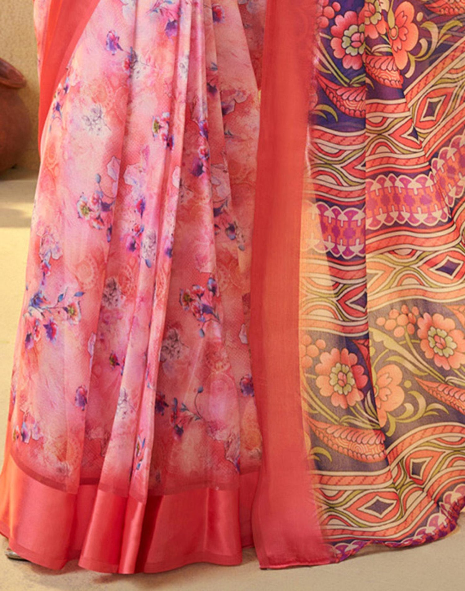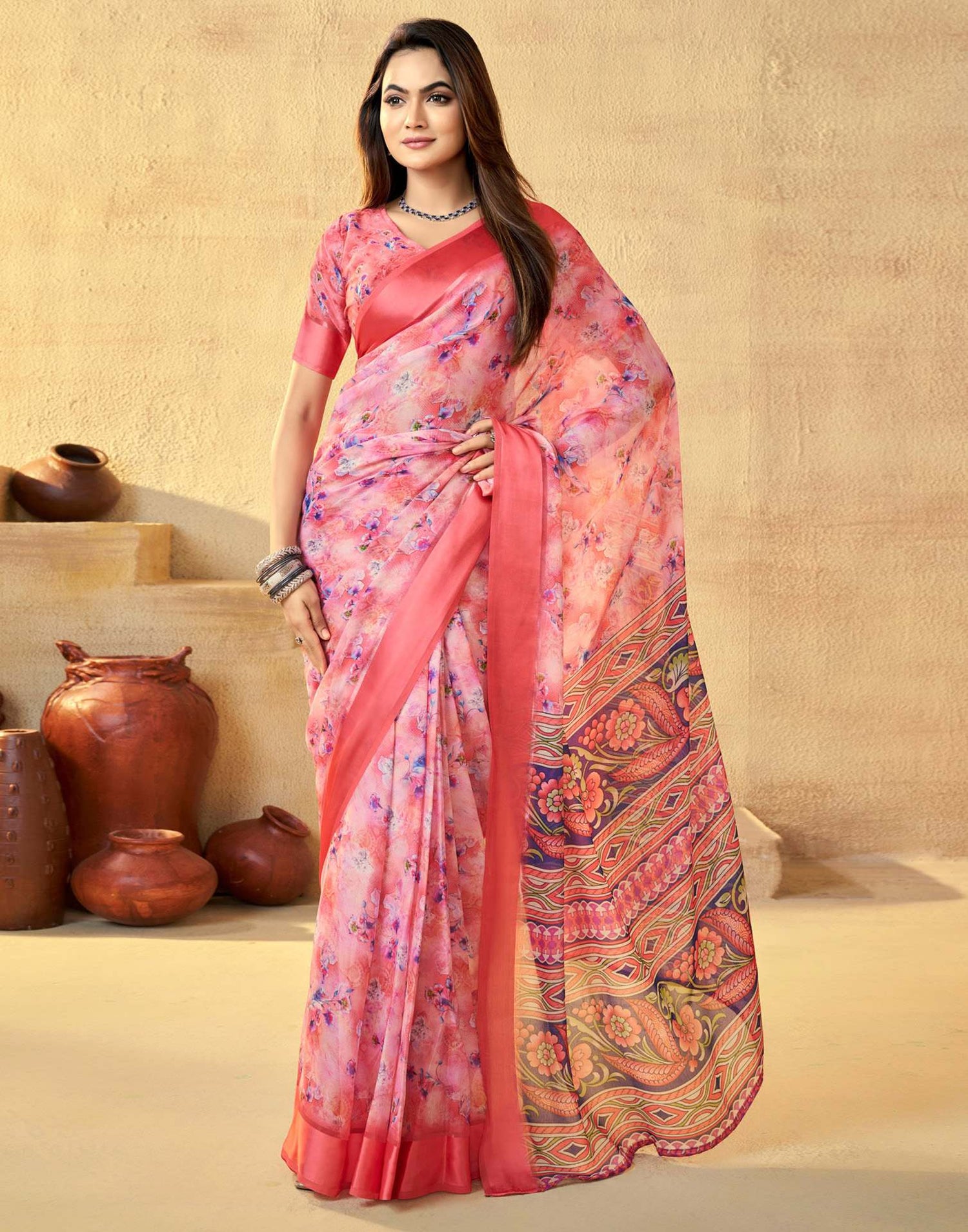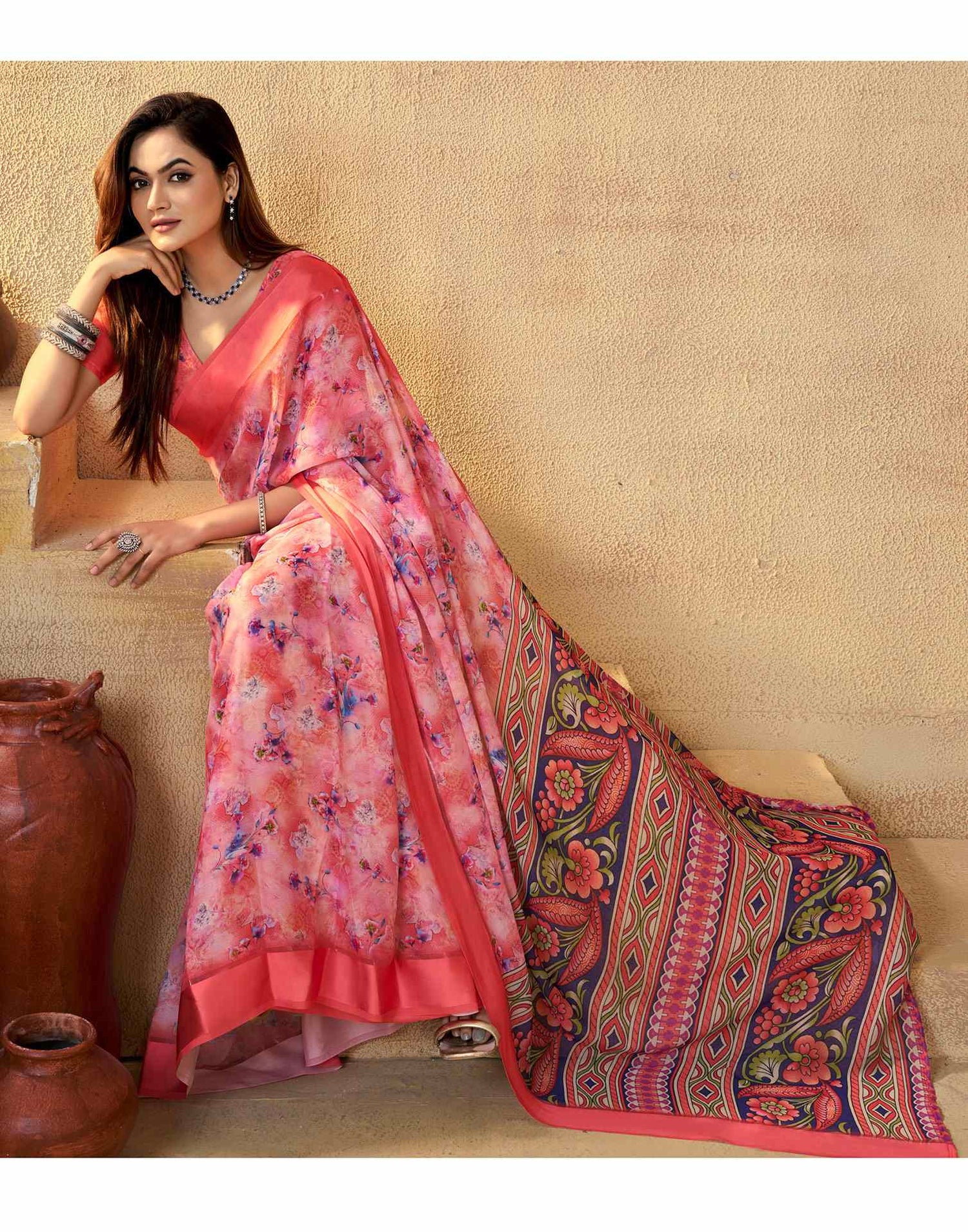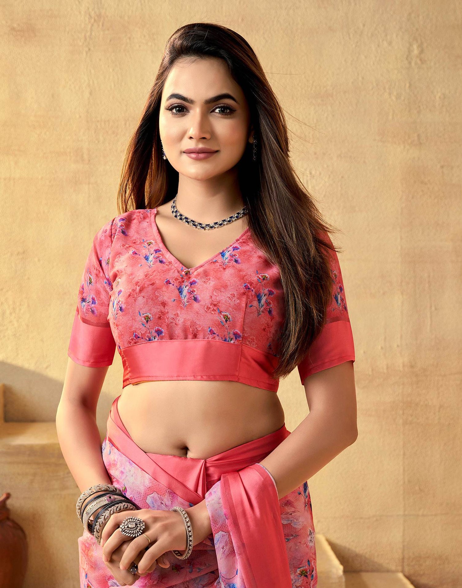 Ready To Wear Coral Red Georgette Floral Printed Saree